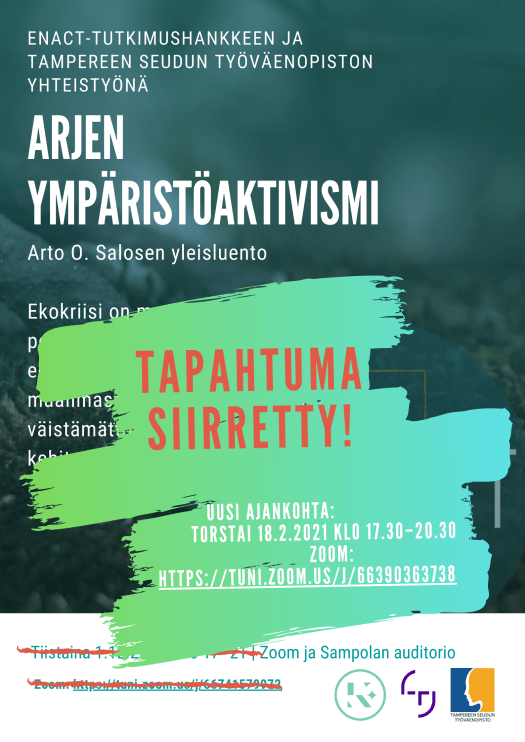 Arto O. Salosen Arjen ympäristöaktivismi -luento Tampereen työväenopistolla on jouduttu siirtämään vallitsevan koronatilanteen ja uusien määräysten myötä.