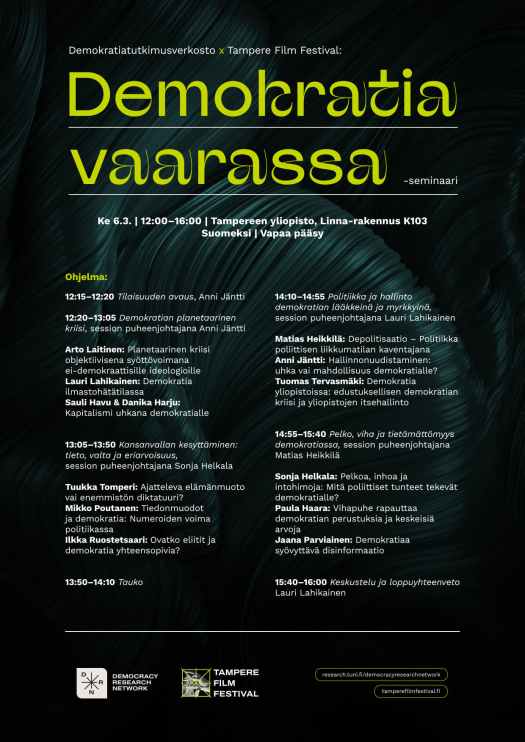 Tampereen yliopiston Demokratiatutkimusverkosto oli mukana järjestämässä Demokratia vaarassa -nimellä kulkevaa ohjelmistokokonaisuutta tämän vuoden Tampereen elokuvajuhlilla. Kokonaisuus koostui näytöksistä, näytösten yhteydessä järjestetyistä paneelikeskusteluista sekä Tampereen yliopistolla pidetystä seminaarista.