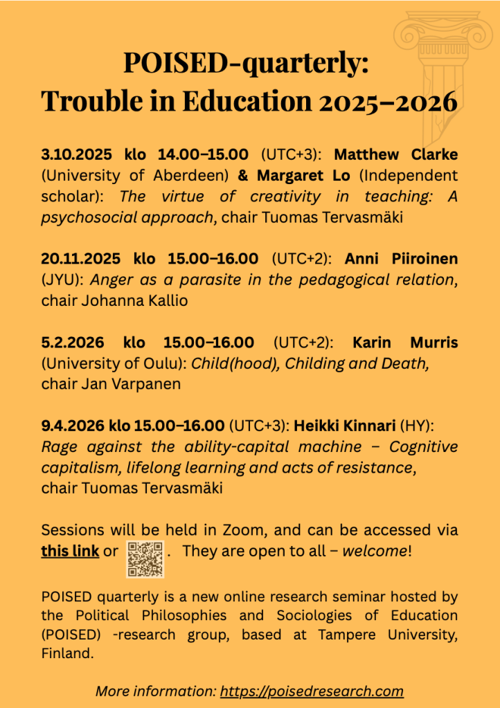 In her presentation, Piironen examines Michel Serres’ concept of the parasite and combines it with empirical data to interpret the conditions for encounter in the pedagogical relationship. By analyzing the teacher’s feelings of anger, she outlines the basis for a new theory of pedagogical relationship.